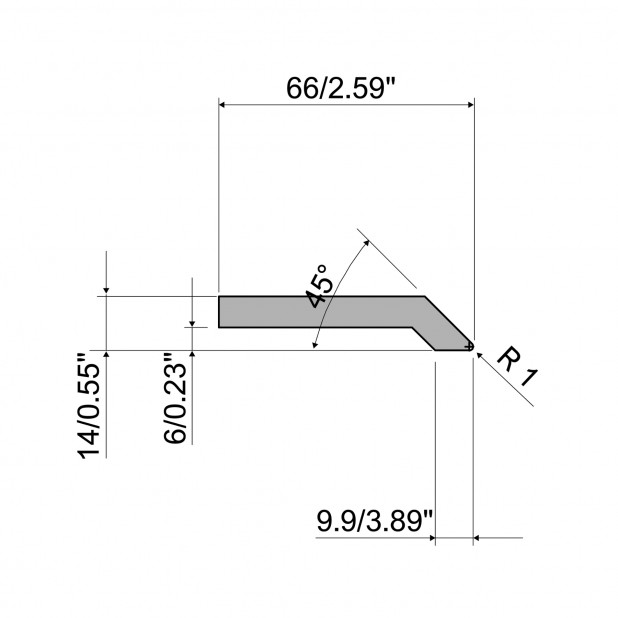 Utensile superiore - H utile 14 mm - angolo piegatura 45° - Raggio 1 mm - Scaricato